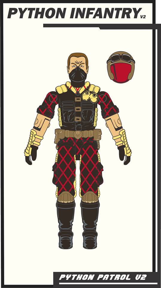 Python Infantry v2 came with a gray rifle (Infantry Officers), black backpack (Infantry Officers), and a gold helmet (Infantry Officers).